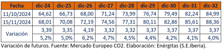 En lo que llevamos de año 2024, hasta 15 NOV 2024, tenemos una media spot acumulada de que se mantiene en 65,0 €/tCO2, nivel similar al acumulado hace un mes, superando el nivel acumulado de otoño 2021, pero aún estamos en otoño y queda mes y medio hasta «las uvas”, que igual nos atragantarán como en 2022 y 2023. Ojalá no lleguemos al nivel especulativo de dichos años, pero los futuros pueden volver a repuntar en cuanto se retomen posiciones para arbitrar entre el medio y largo plazo. Una degeneración del valor económico inducido del derecho a emitir CO2. Tendría que caer por debajo del nivel de 5 €/tCO2 para que estemos hablando de un commodity sensato y no un precio exorbitante y descontrolado, que está haciendo menos competitivo el coste final de la energía a nivel pan-europeo. Se ha vuelto un commodity de súper lujo en muy poco tiempo, afectando a todos (los consumidores) independientemente del país europeo donde se encuentre el punto de suministro, pero unos con más capacidad de pago que otros.