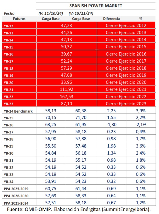 • Futuro 2026 ha empezado a cotizar desde 2 Ene 2024, con valores acumulados entre 25,5 y 35,6 y media 31,0. Última cotización a 34,7 (15 NOV 2024).